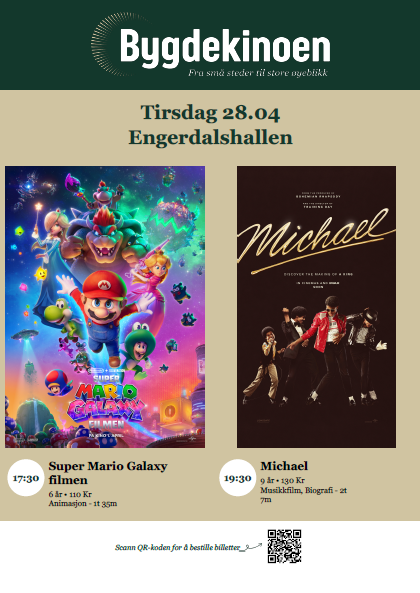Kl. 17:30 – Super Mario Galaxy filmen 1 t og 35 min, 6 års aldersgrense. Les mer om filmen og se trailer her: Super Mario Galaxy filmen - 2026 - Filmweb