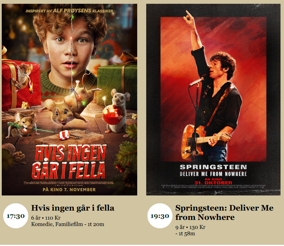 Kl. 19:30 Springsteen: Deliver Me from Nowhere – 1 t og 58 min, 9 års aldersgrense. Les mer om filmen og se trailer her: Springsteen: Deliver Me from Nowhere - Filmweb