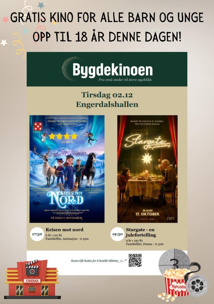 Engerdal ungdomshus selger litt drikke og godteri/snacks før begge filmene, betaling via vipps. Frivilligsentralen selger også ny-poppet popcorn!