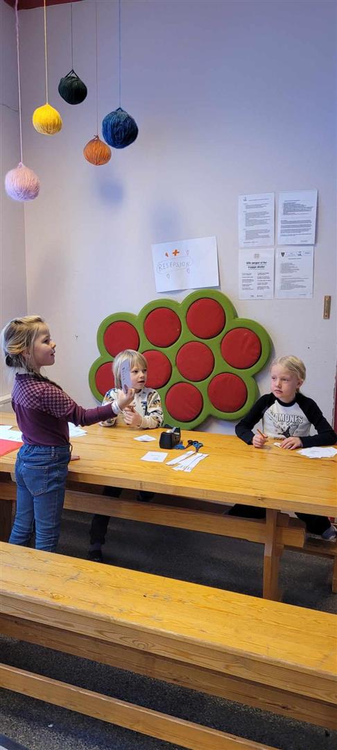 Hele gårdagen og deler av dagen i dag leker vi lege og sykehus. Vi har 3 legerom, 1 operasjonssal, apotek, resepsjon og venterom. Mange ulike skader og sykdommer, så det er hektiske dager. Mye fin læringsaktivitet hvor det skrives timekort, journal og resept. Vi har kølapp-system. På venterommet leses det bøker og Donald Duck.