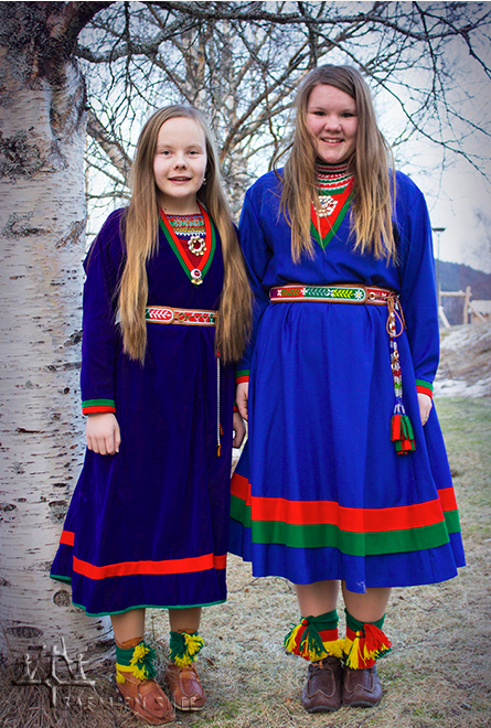 Gunilla Påve Wilks til venstre og Inga Emelia Joma i henholdsvis jentedrakt (før konfirmasjonsalder) og kvinnedrakt (etter konfirmert alder). Skobånd og læstoe/bånd på nederste del av drakten kan fortelle om kjønn, alder og sivil status.