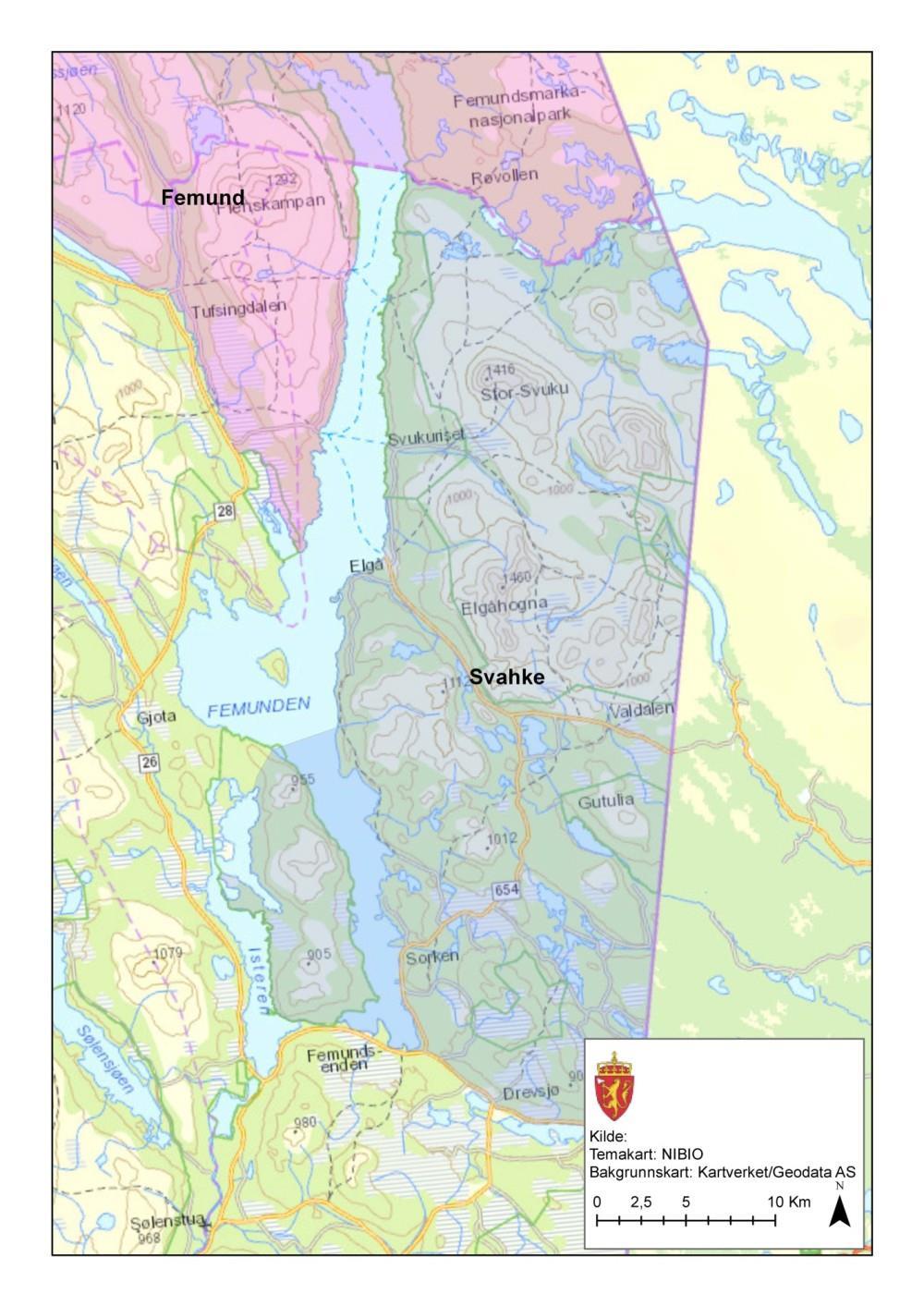 Navnet Svahke – som i genitiv blir til Svahken – er det samme navnet som på norsk blir til Svuku. Svahke kalles det største fjellet i området på sørsamisk eller Stor Svuku på norsk. Vinterbeitene er i hovedsak i Femundsmarka, mens kalvingsområder og sommerland er i fjellområdene sentralt i reinbeitedistriktet, delvis helt inn til svenskegrensa. Sørligste delen av distriktet benyttes i hovedsak som høstbeiter. 75 % av distriktet ligger innenfor verneområder. Nabodistrikt er Femunden vinterbeitedistrikt i nord. Svahken sijte grenser også mot Idre sameby på svensk side. Det er to korte strekninger med sperregjerde helt sør i distriktet.