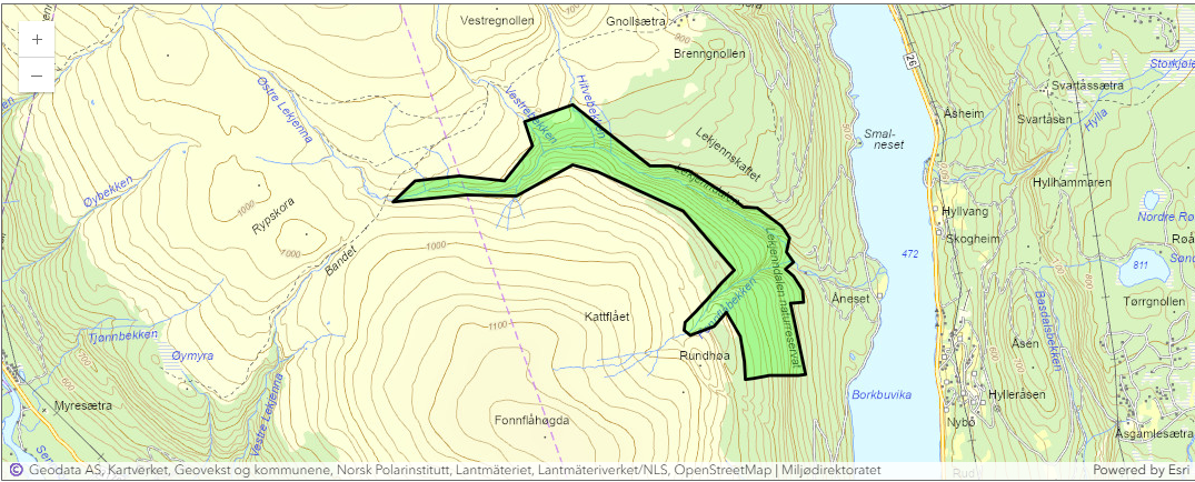 Lekjenndalen er en øst-sørøstvendt bekkekløft langs fire elver: Østre Lekjenna, Vestrebekken, Hitvebekken og Fånnflåbekken. Kløfta er dyp og trang i nedre del, med jevnt bratte hellinger opp på skyggesida og bratte kalksandsteinsberg på solsida. Kløfta blir gradvis grunnere innover og glir over i slake fjellområder. Gammel granskog dekker nesten hele området. Boniteten varierer fra lav til høy. Området ligger i mellomboreal og nordboreal vegetasjonssone.